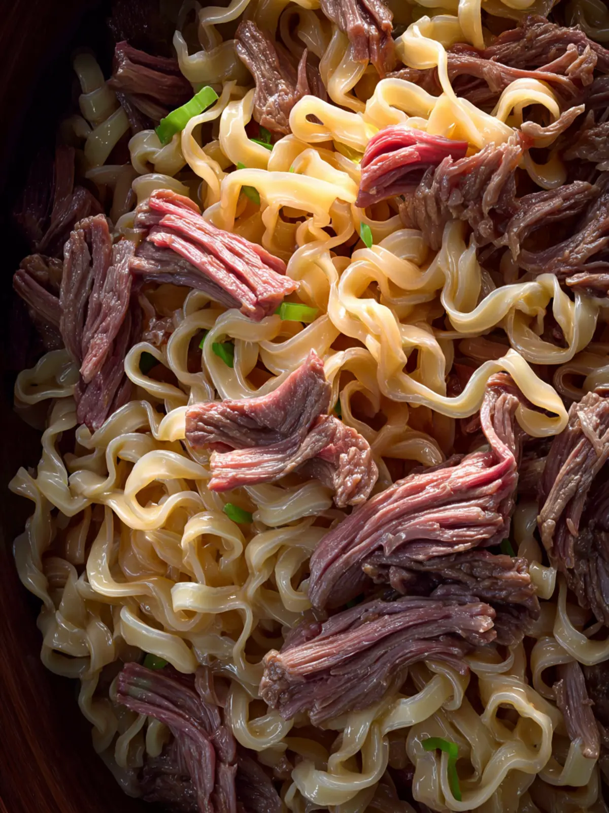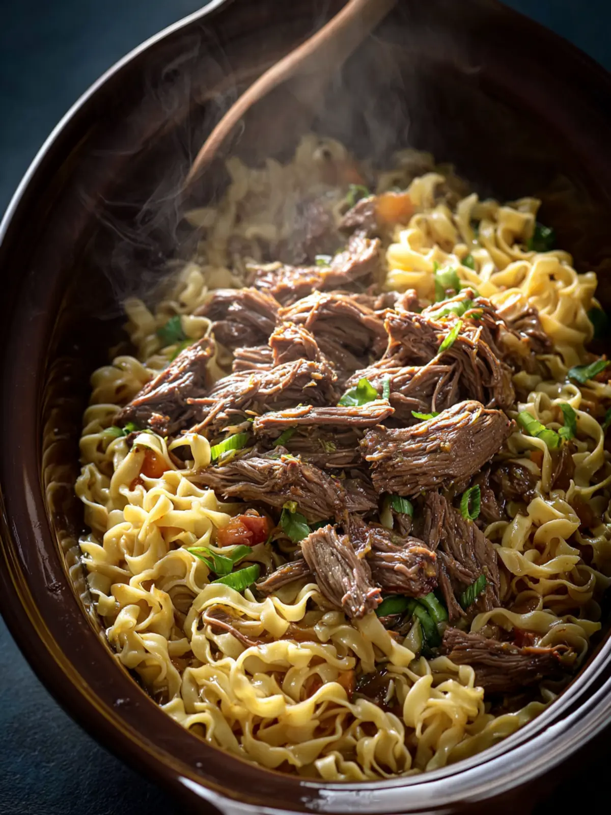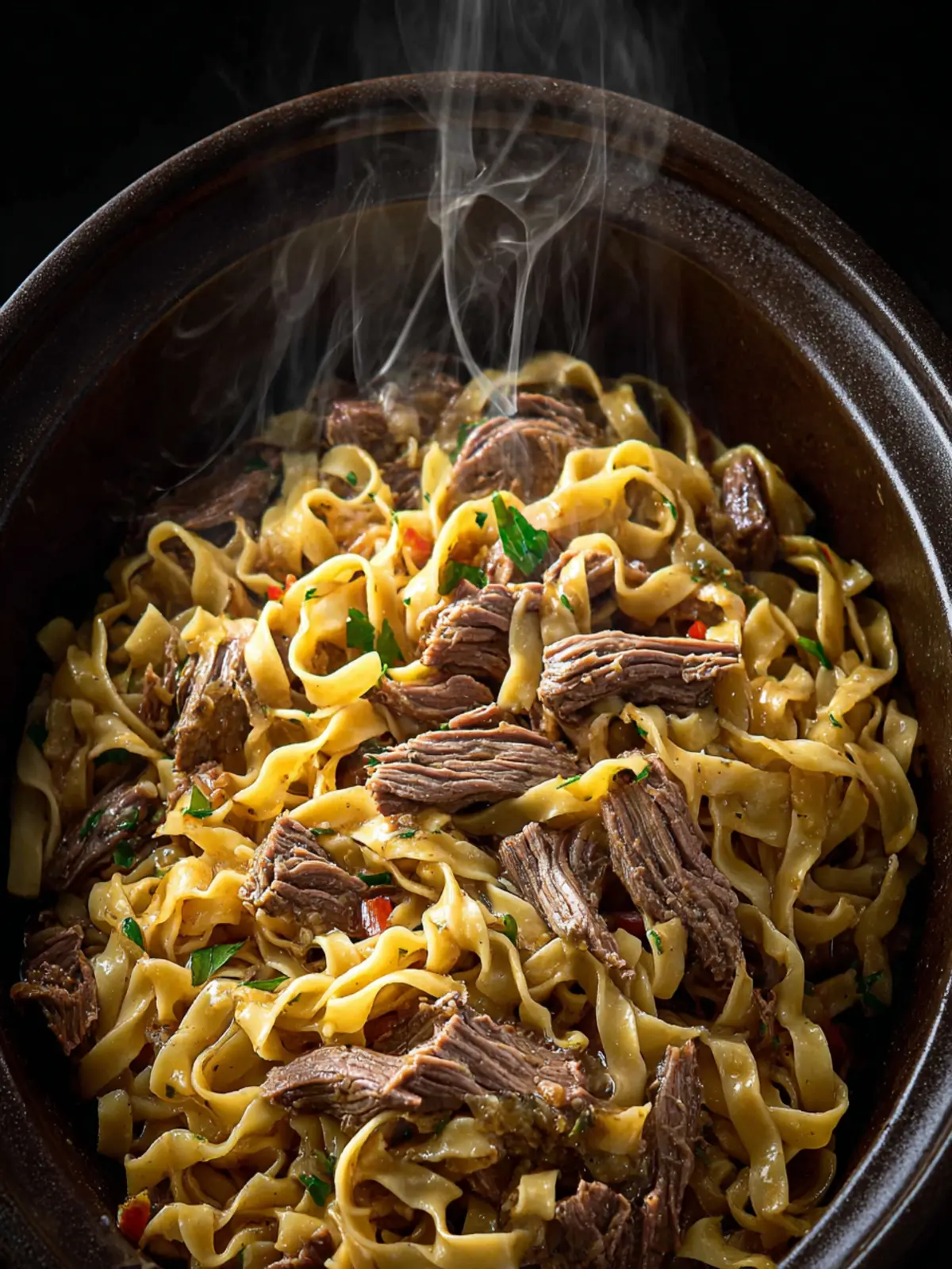 A comforting slow cooker dish featuring tender chuck roast and egg noodles in a rich gravy.