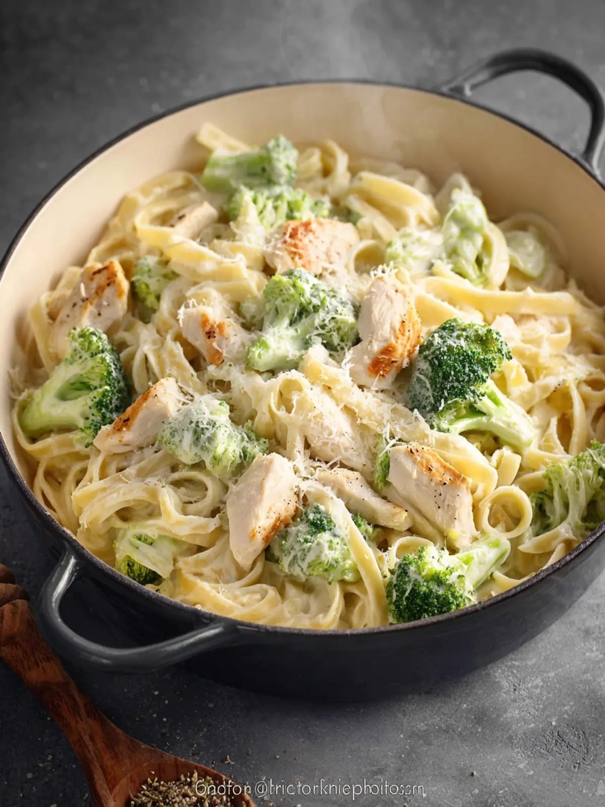 A creamy and delicious fettucine dish loaded with broccoli and chicken, perfect for a quick weeknight dinner.
