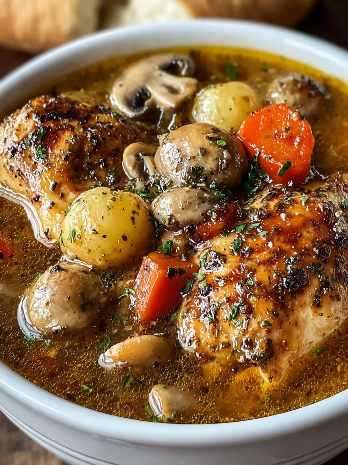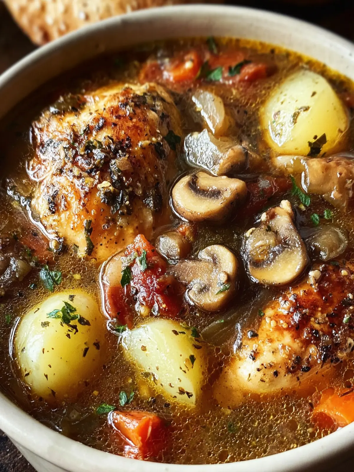 A hearty and comforting dish featuring tender chicken thighs and savory mushrooms.