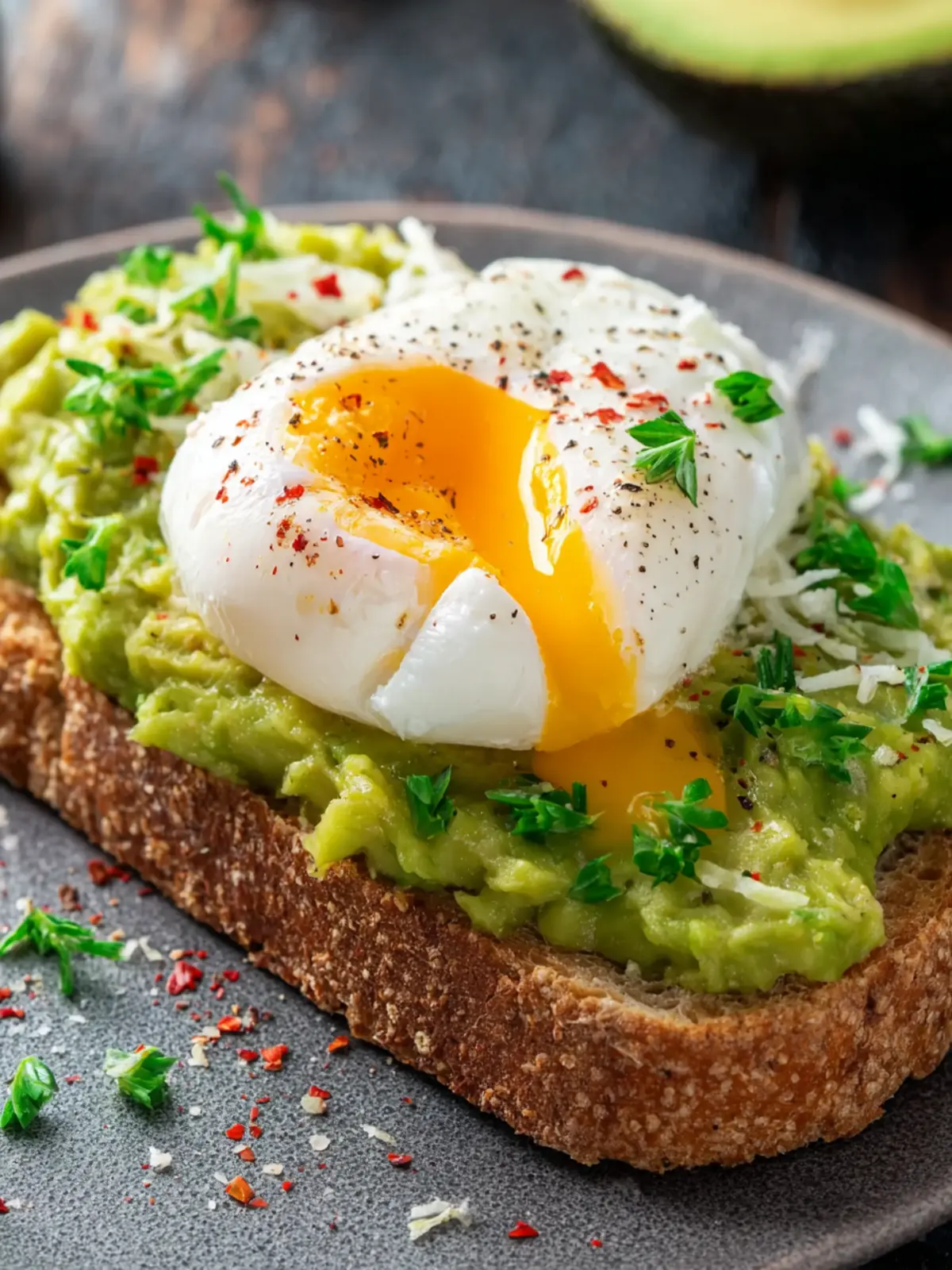 A delicious and nutritious avocado toast topped with a perfectly poached egg.