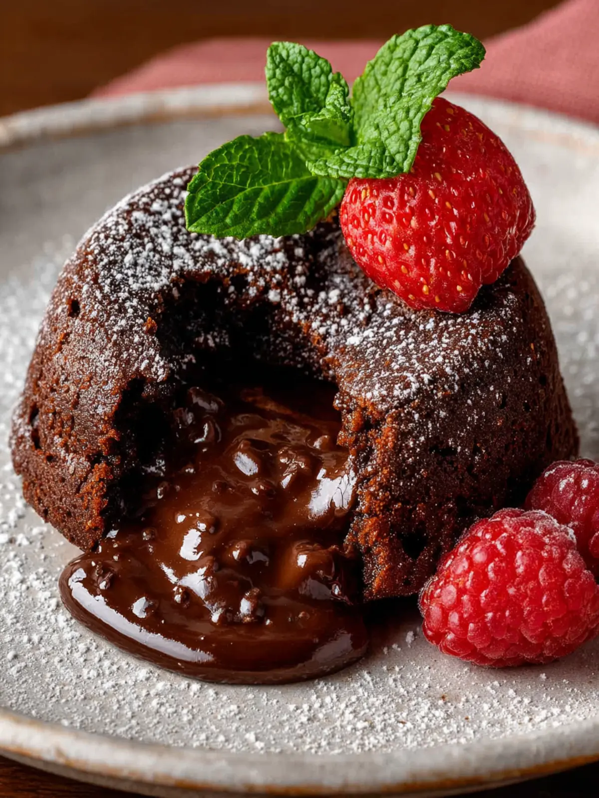 A delicious molten lava cake that is rich and chocolatey, perfect for dessert lovers.