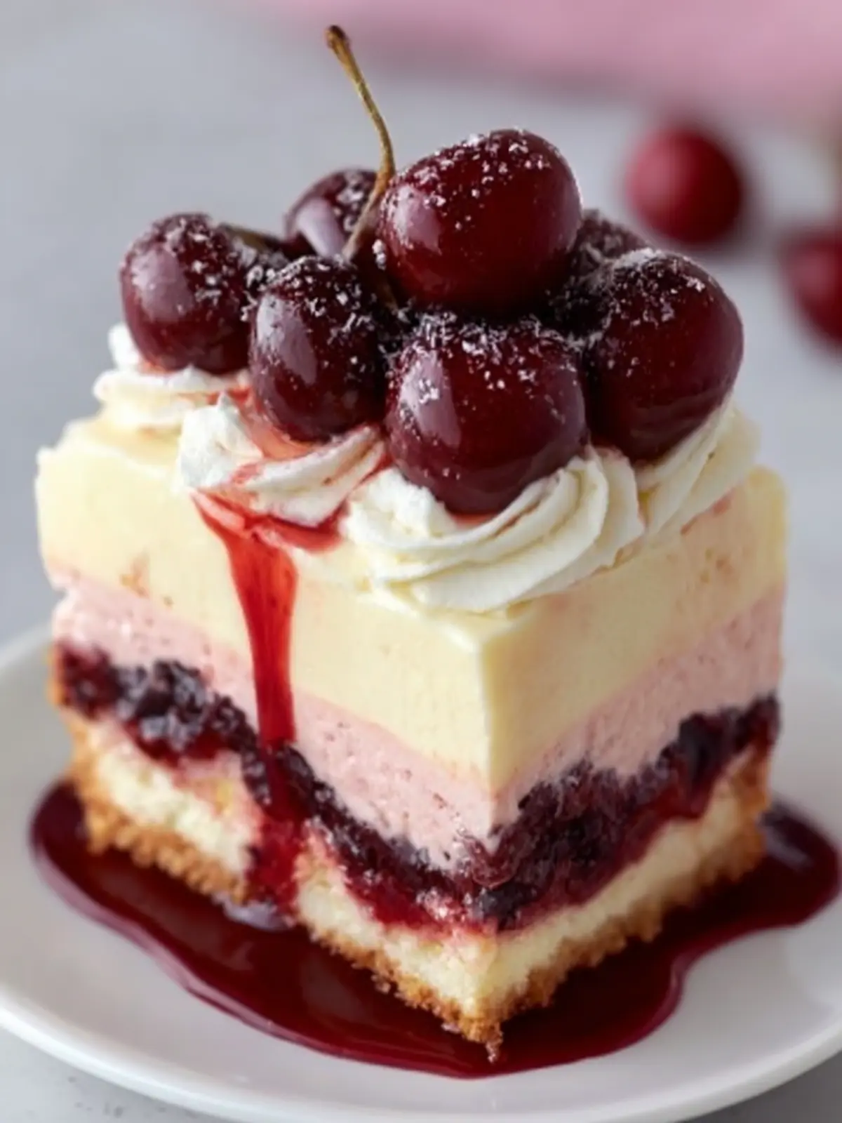 - Serve: Remove from the springform pan. Garnish with fresh cherries before serving.